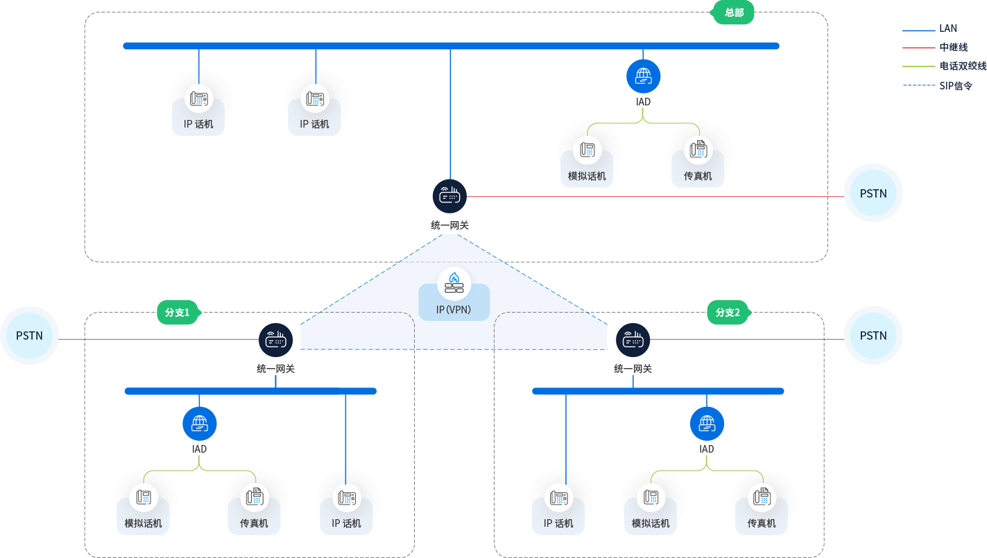 - 分支电话组网时,各地部署 U19XX,设备之间通过网络采用SIP Trunk 对接,实现互联互通。