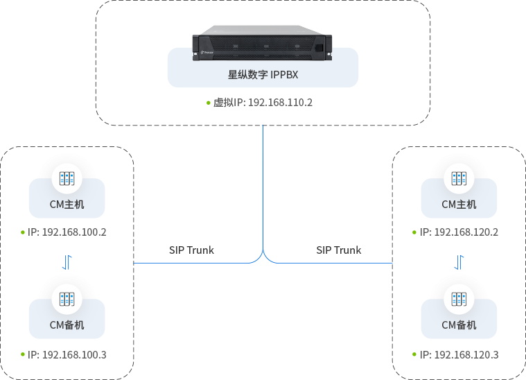 - 以右图为例,星纵数字 IPPBX 需要分别对 192.168.100.2、192.168.100.3、192.168.120.2、192.168.120.3 四台思科设备创建4条 SIP Trunk 用于对接。