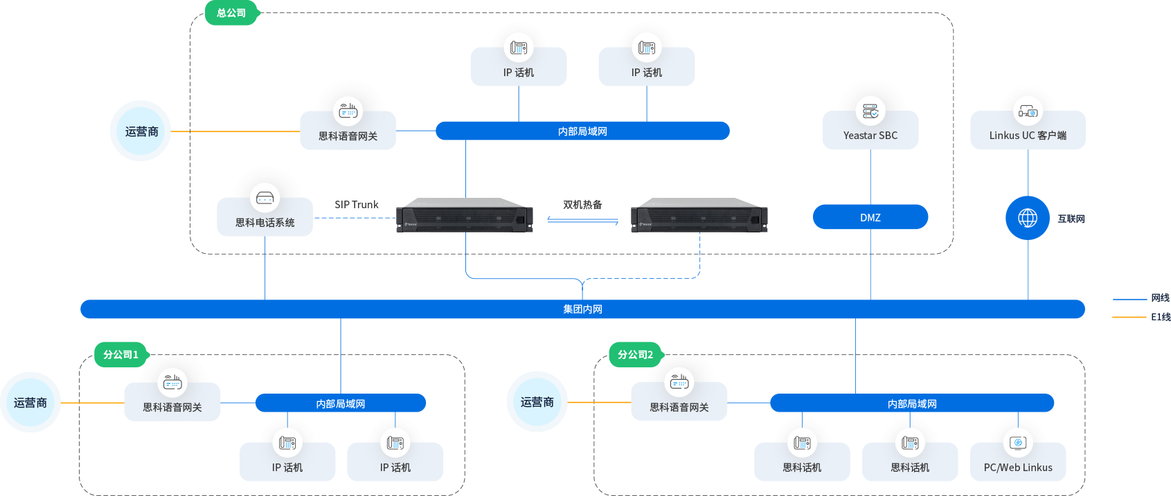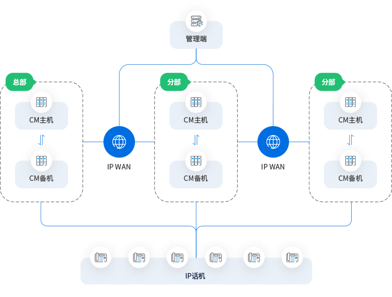 - 管理端和呼叫处理器组成集群,IP 话机也一般按照区域指向呼叫处理器。